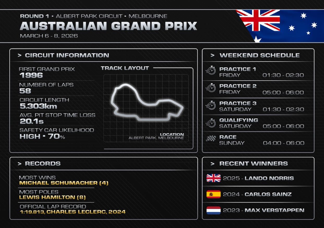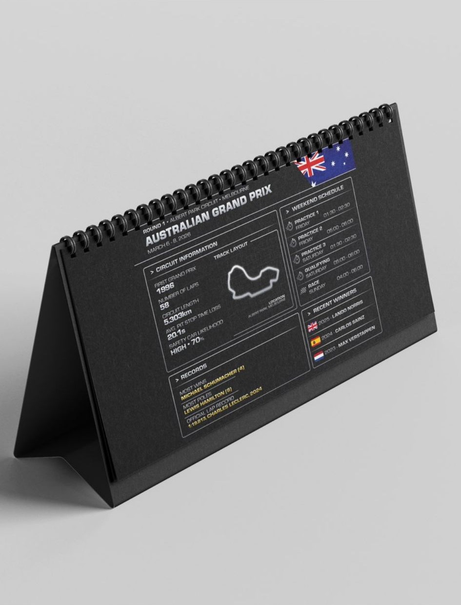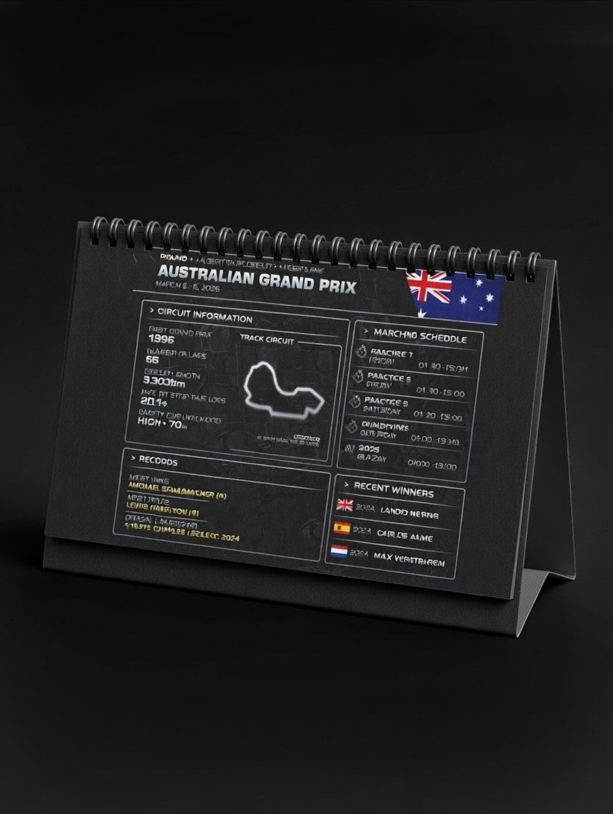 A clean, desk-ready Formula 1 Grand Prix schedule built for fans who want every race, circuit, and key stat at a glance, designed to sit permanently on your desk and be used all season.